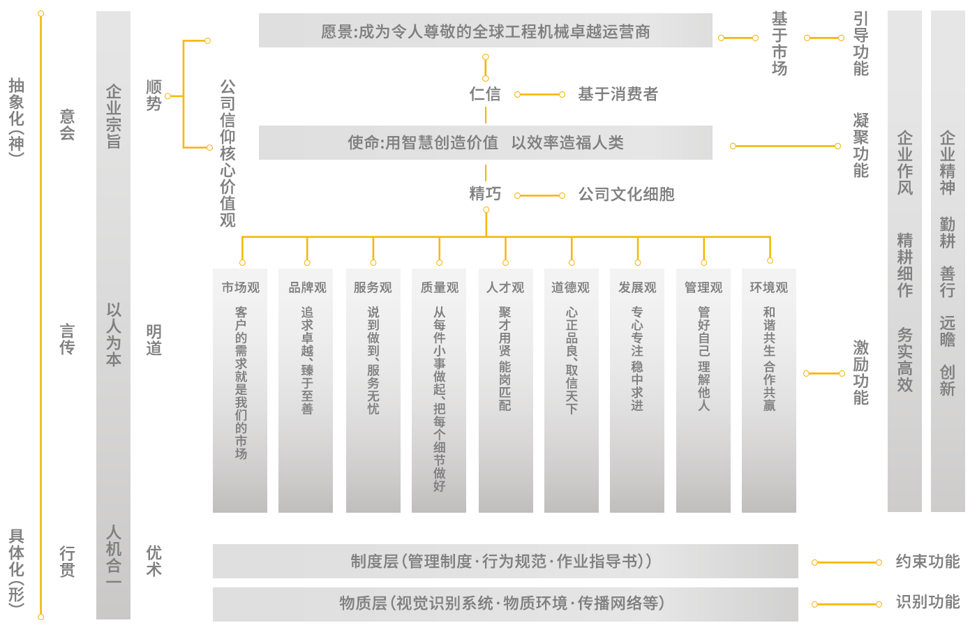 制度层和物质层部分的内容,对企业和员工的所有行为予以标准化、规范化、系统化的管理,形成了企业统一的形象,便于统一的经营管理,在文化中起着约束和识别的作用。与明道相对应,这一部分是优术,重在寻求文化落地的渠道和途径。